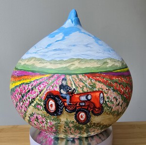 2024Deze minibol heb ik in opdracht beschilderd als dank voor Autohopper Voorhout die de beschilderde Giant Tulips altijd brengt naar de plek van plaatsing in de Bollenstreek . Deze is verkocht bij Galerie De Zwarte Tulp in Lisse.